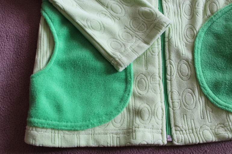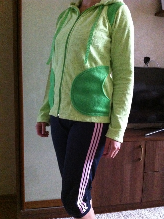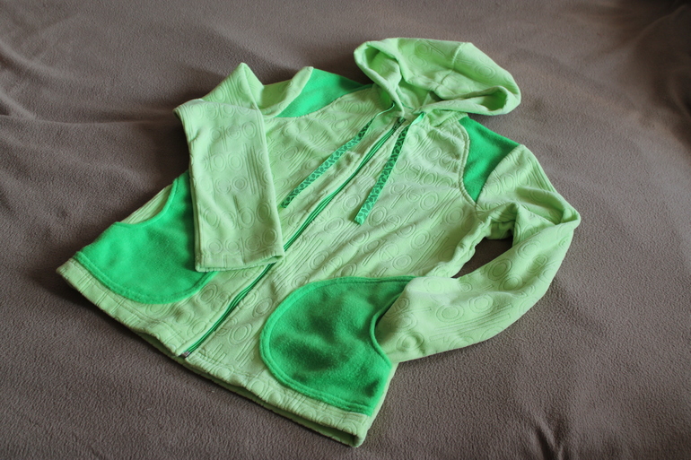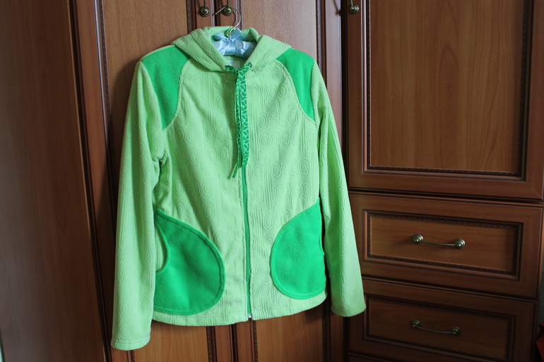 Выкройка из Бурды 1/2002 мод.126. Укоротила на пару см рукав, показался очень длинным. Не зря) И удлинняла саму толстовку. Использован флис-антипиллинг салатовый и обычный зелёный,замок-молния и репсовая лента для отделки. Модель простейшая с центральной застёжкой и накладными карманами. Зелёного хватало только на карманы,и чтобы они не смотрелись заплатками,сделала вставки на полочках,вшила зелёную молнию и использовала репсовую ленту в тон зелёномы флису.