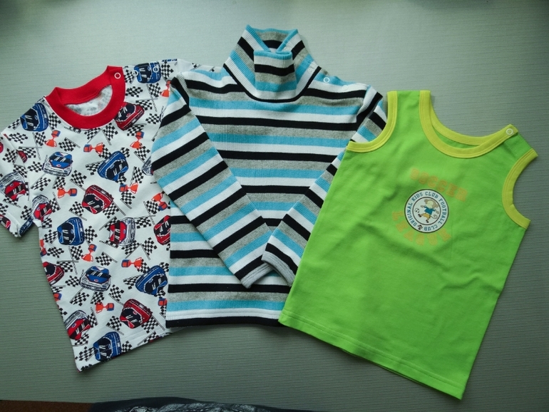 А это вчера сшила футболку. водолазку и майку для мальчика на рост 100. У парнишки большая голова, одеть на него футболку большая проблема. Мама попросила сделать застежки на кнопках.