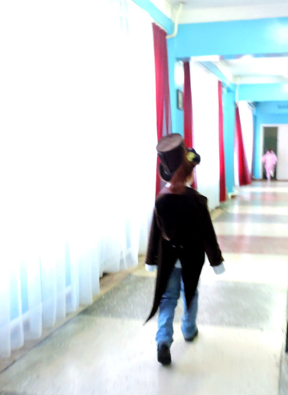 Фрак и шляпа из стреч велюра, очки, девочки)), из пивных банок, стекол от сварочных очков и оправа из кожи старой сумки.)) Выкройку фрака взяла из костюма пингвина, там жилетка была. Поэтому горловину полочки сделала не такой глубокой, воротник и рукава смоделировала. И постоянно подгоняла фрак. Было сложно, но я справилась.)