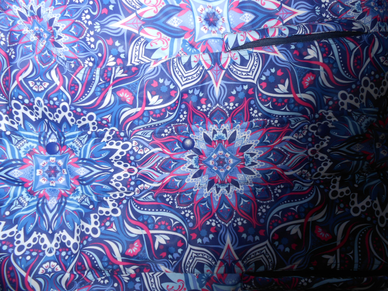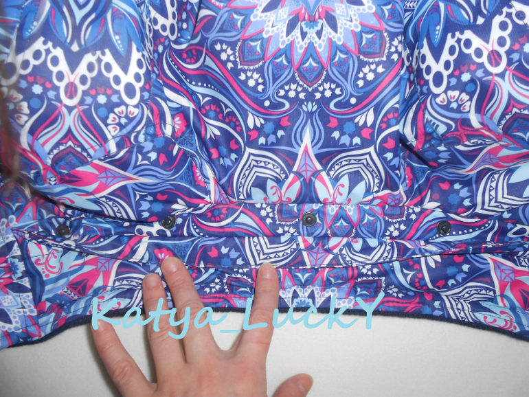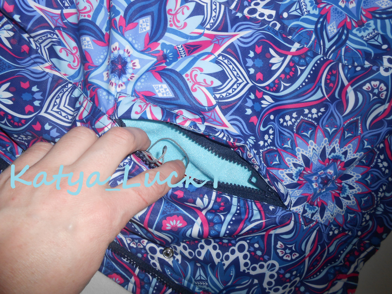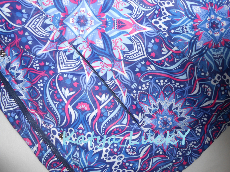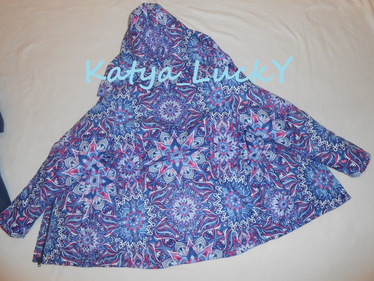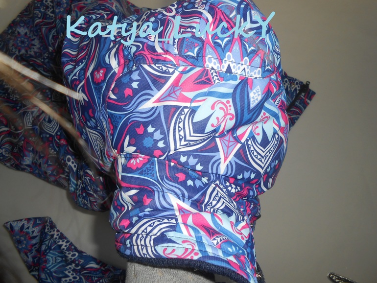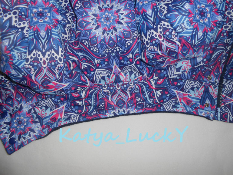 - внешняя ветрозащитная планка выполнена точно в принт, рапорт по центру пестрых кругов. На готовом изделии создаеься впечатление, что молнии нет вообще.