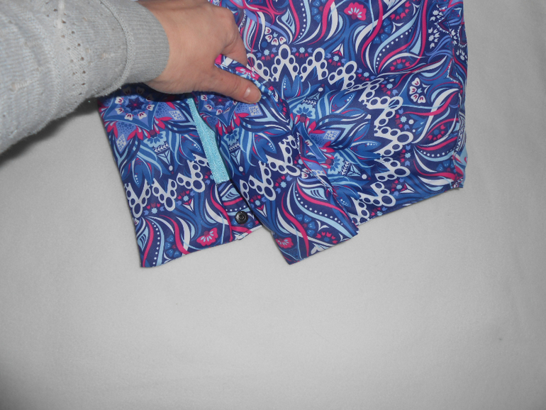 - Карманы на том же уровне, что и в выкройке, но сделаны по другому. Карманы на молнии но спрятаны клапанами, клапаны подобраны по принту. Рамка кармана в сложную полуовальную рамку. Клапаны идут от бокового шва к центру (так на спортивной одежде делают)