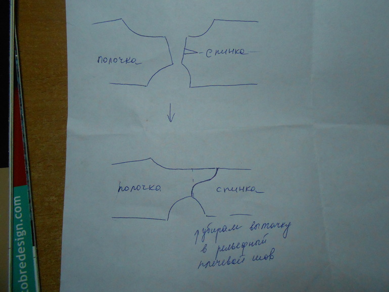 - Фигурная линия плеча. У меня по выкройке для хорошей посадки спинка идет с вытачкой (у отто всегда такая посадка). Мне не хотелось грубого перехода и плюс еще вытачка съела бы рисунок. Делая такую сложную линию плеча, убирая тем самым вытачку