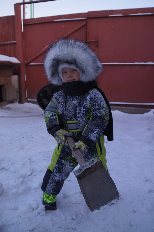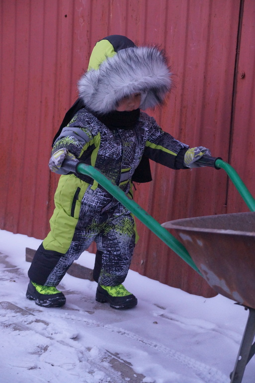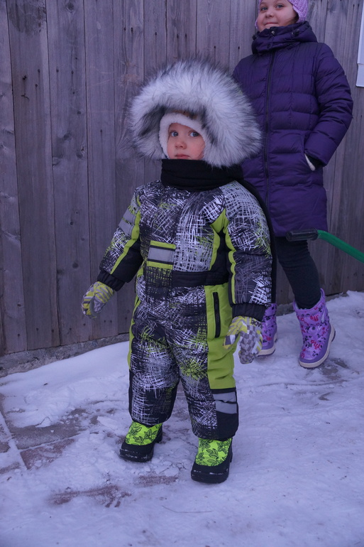Опять впопыхах ткань заказала и на момент пошива у меня оказалось три отреза по 0,5 (чем только руководствовалась?). Собирала, ругала себя, но шила. Утеплителя много затолкала - 200+150 альполюкса + флис на подкладе (на рукава и в штанины всё же подкладочную лучше ставить). Выкройку взяла из оттобре 4 2014. Горловину заузила, пройму немного опустила, рукав расширила, воротник по готовой горловине скроила. Выкройку взяла на 98 (хотя изначально на 104 перерисовала), получилось прям как раз, но нужно было всё же больше делать. Сделала трикотажные манжеты на юбочках - получилось очень тесно с крагами, убрала, вшила манжет на резинке. В штанинах юбочки с обычной резинкой. Планка собрана из остатков. Кап выкроен по капюшону со старой куртки - удобный. Всё супер просто. Комбез получился очень тёплым, одеваем на водолазку и колгтки. Даже в -24 было тепло. Фоткались, кстати, в -22. Опушка мужу не нравится, но я её уже на кнопки посадила. Спасибо Кате за онлайн пошив. Почитала, посмотрела, и заставила себя сделать это. Фоткаться успеваем только у бабушки, пока занят своими важными делами, даже собаку снегом успел покормить.