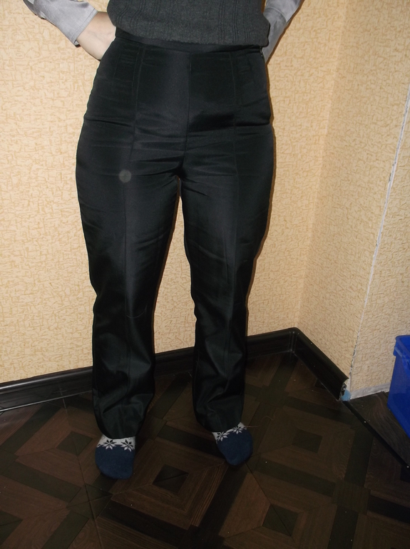 Итак, брюки. Черная плащевка на флисе, для зимы. Очень толстые и теплые получились, ношу их с удовольствием. Карманы на попе - обманки. Стрелки застрочила по краю, утюгом они совершенно не держались. Молния потайная в боковом шве, впереди классический бант не стала делать, чтобы не подчеркивать и без того выступающий живот((( (пятно на объективе, не на брюках)
