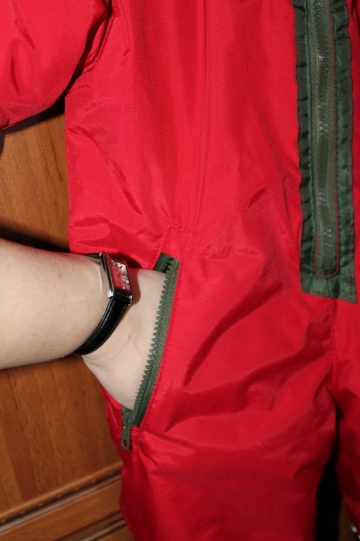 Модель простого кроя,с центральной застёжкой-молнией в рамку,на левой полочке карман-обманка,нижние карманы большие, в рамку на молнии,рукава втачные одношовные с патой. Нижняя часть штанин без шагового шва. Капюшон двухшовный с утяжкой шляпной резинкой,затягивается сверху,резинка,чтоб не топорщилась,прихвачена декоративной накладочкой из стропы.
