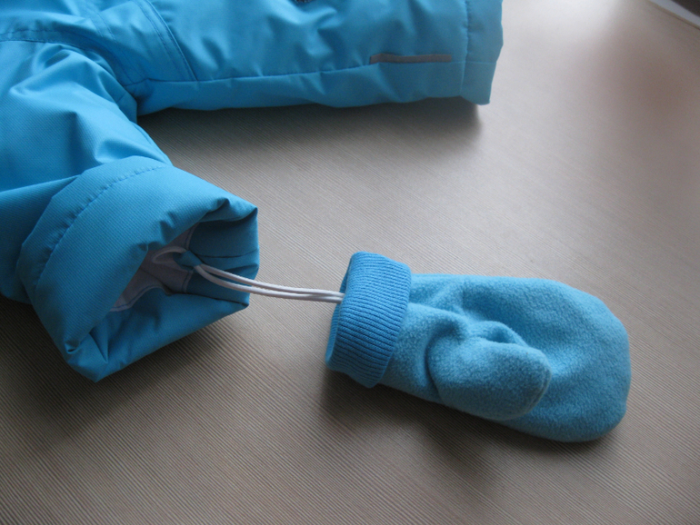 далее варежки двойные флисовые голубенькие, на петельке резинке, она крепится к петельке вшитой внутри рукава, ребенок не любит варежки, может быть эти будет одевать, но поскольку скидывает все время то вот такая петелька (на зимнем комбезе так же поступила). Пока руки красными не станут и он не заорет - варежки трудно одеть.