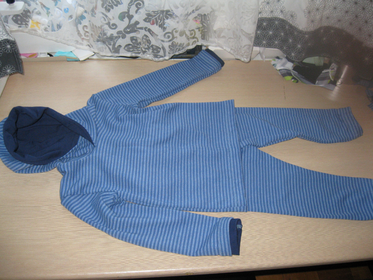 ткань интерлок с начесом, приятная мягкая, после стирки чуть скатывается с изнанки, синяя кулирка