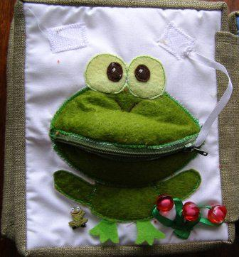 4 разворот: Лягушка и Морское дно. Лягушка большая и маленькая. Большая умеет открывать рот (молния) и показывать язык-резинку, а еще может съесть летающую стрекозу.