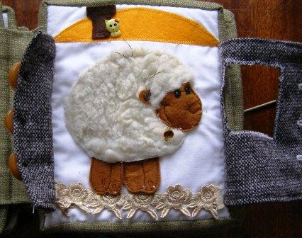 2 разворот: улитка-лабиринт, цветочек и усики тактильные, можно потаскать. Домик - пуговки. На крыше поселился котик-пуговка, а в домике живет овечка.