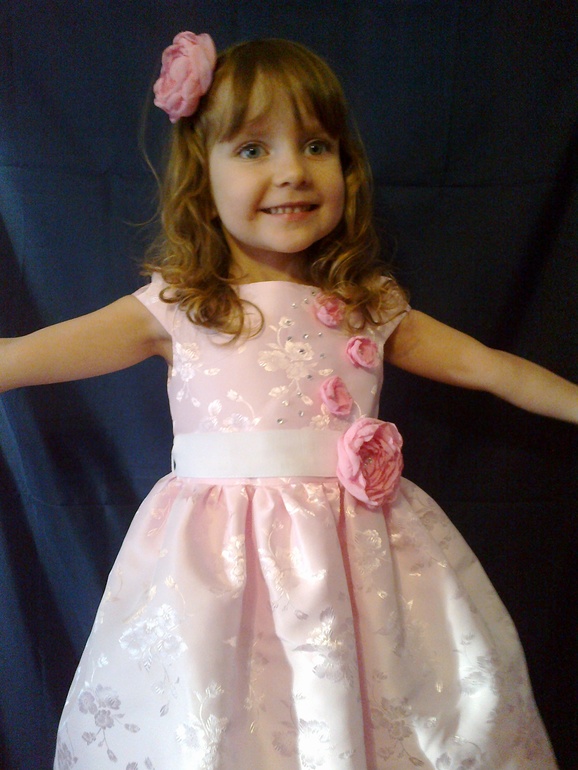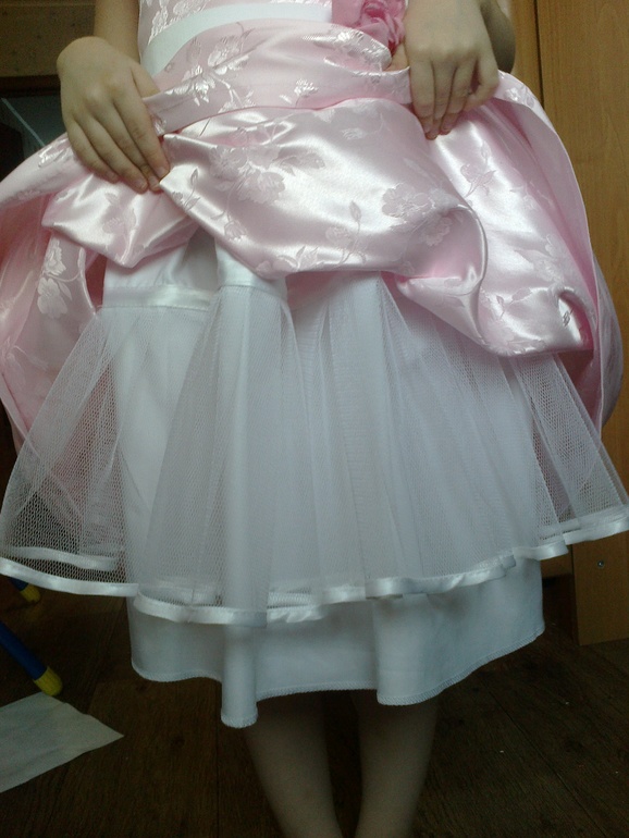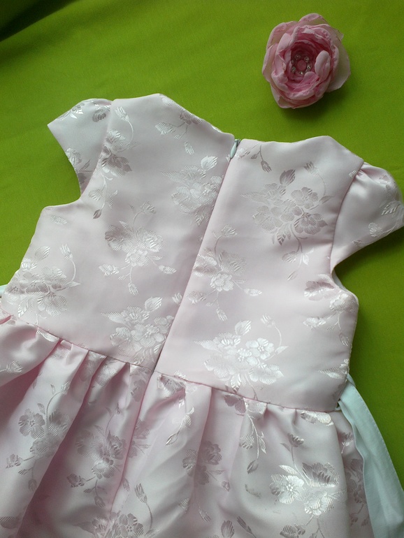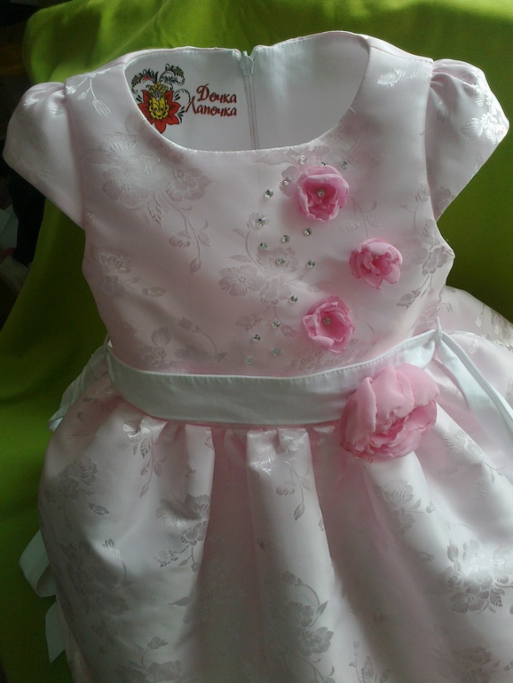 Ткань атласный жакард. Рост 100. Ткани брала 80 см. На Подклад 80 хлопка. И жесткий фатин дома нашелся. Хотела сшить голубое. Пошли с дочкой ткань выбирать. Ухватилась она за розовое. Я предлагаю ей персиковое. А она- персик я лучше съем, а платье хочу розовое:-). Выкройка моя. Юбка просто на сборке. Цветы из шифона делала первый раз. На поясе съемный на булавке. Стразы пришивные.