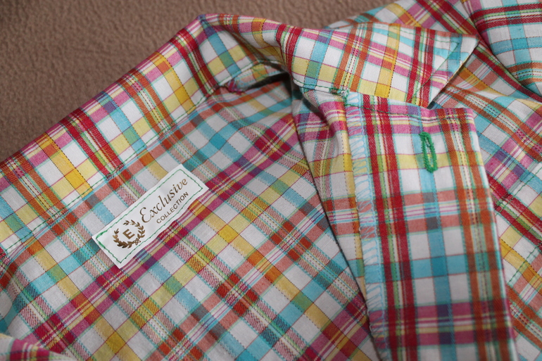 Рубашка. Простая,с накладным карманом на левой полочке,воротник без стойки,борта обработаны подбортами,в боковых швах разрезики. Рукава втачные,короткие. Застёжка центральная на пуговицы. Петли вымётывала вертикально. Клетка не симметричная,подогнала не совсем верно полочки. Зелёный прозрачных пуговок не нашла,пришила белые.