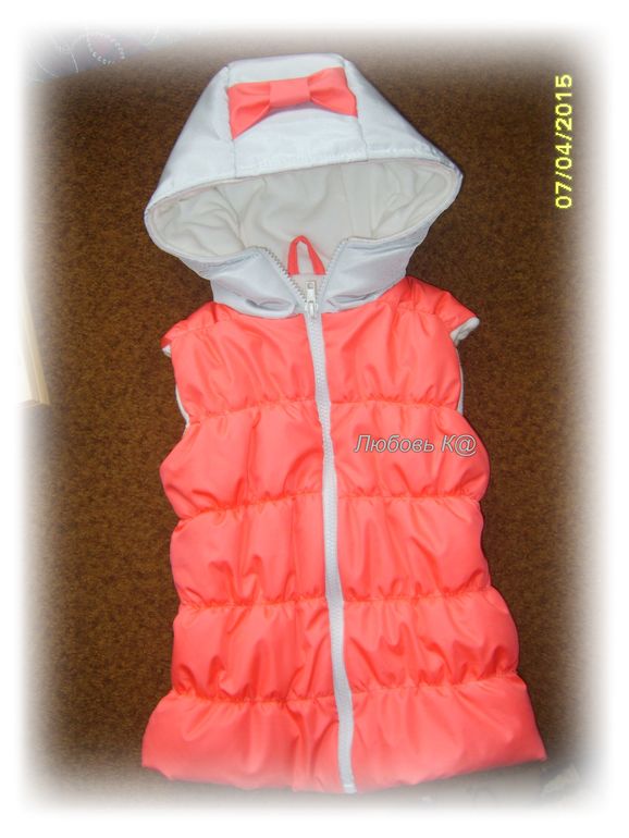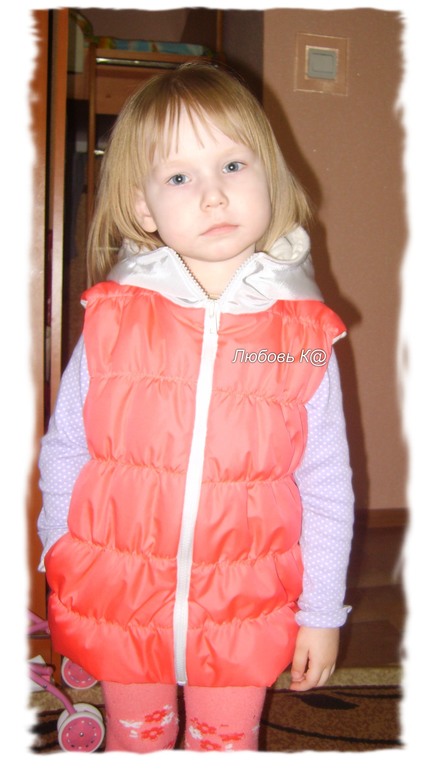 Шьем детямБлагодаря Марии, пошился такой жилетик для дочки. Коралловая дюспа в сочетании с серой тафтой ничего вроде вышло. Эх, и замучила я Марию вопросами, но она мне очень помогла. Выкройка 2013-1 12 оттобре, только кап двушовный сделала.