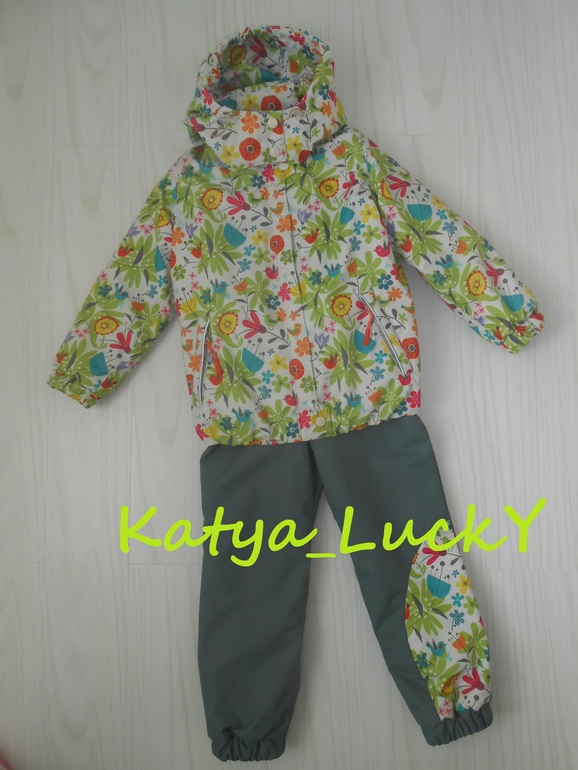 Принтованная мембрана с тефлоновым покрытием (основной фон светлый беж, в тон фона выбрана фурнитура молнии и кнопки с пластиковыми шляпками, чтобы не бросалась в глаза), брелки на молниях кораллово-оранжевые в тон цветочков. Подклад просили поставить хлопковый, выбрала оливковую плотную кулирку с лайкрой. Цвет брюк - серый с оливковым отливом, по тону не совпадает с серым на куртке, но хорошо гармонирует с общим цветом комплекта.