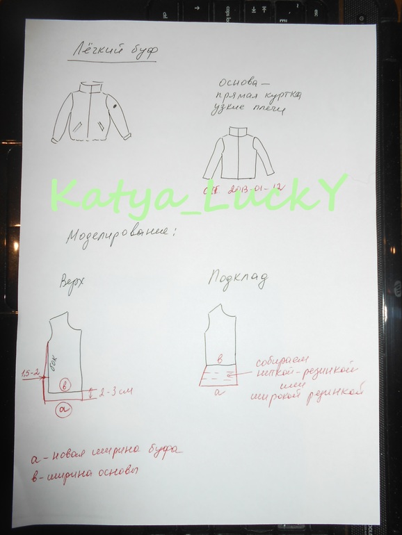 Берем хорошую основу, которая хорошо сидит на вашем ребенке, особенно в плечах, чтобы они были не большими. У меня в основе 2013-01-12, но с изменением под конкретного ребенка ( это уже 6 куртка для одного заказчика, поэтому корректирую под рост и размер). Дальше строим бока, чтобы получить эффект небольшого, я бы сказала деликатного буфа, основу нужно немного изменить - удлинить на 2-3см для свободы, на высоте 3-4 см от низа поставить новую точку в 1,5-2см от бока. От этой точки вниз прямо до подола и наискосок до подмышки. Получается "бочонок". Подклад куртки кроим так: сам подклад идет нерасширенный, по основе куртки до линии подборта-подола, который я делаю 5см. Подборт-подол строится трапецией, от ширины подклада до ширины подола верха. Этот подборт-подол мы строчим мелко (шаг 1см) ниткой-резинкой. Я купила широкую резинку, 45мм и прострочила этот подол такой резинкой с шагом 1см.