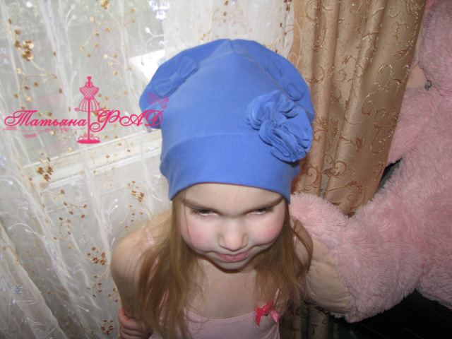 Приветствую всех, очень мало получается рукодельничать, так как готовимся к перезду, по этой же причине не могу пока заказать красивенькие ткани, (т.к. адрес поменяется в любой момент). Поэтому пока взяла свою футболочку и пошила из нее шапочку. Выкройку закруглила не правильно, поэтому получились "торчащие ушки". Решила пришить бантики насквозь, ну и вот что в итоге