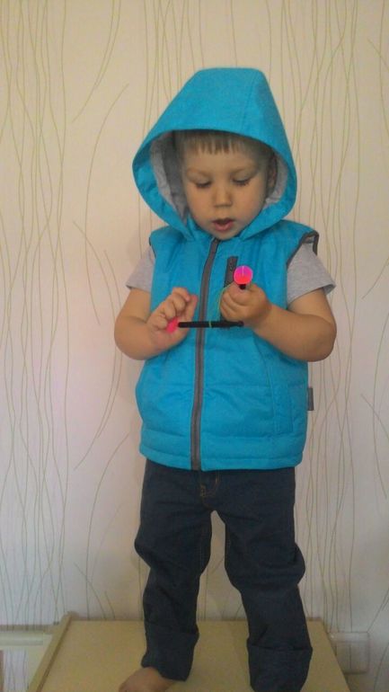 Дошла очередь наконец-то до жилетов. Сшита из мембранной плащевки с утеплителем изософт 100. Размер 92. Сейчас шью точно такую же для мамы мальчика будет фемели лук.