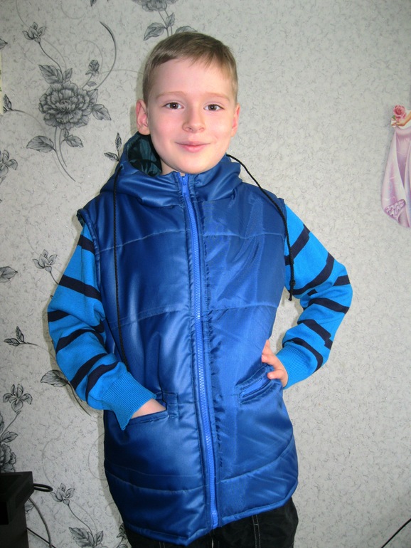 Шьем детямДолго Тимофей ходил и говорил- "Папе сшила..Поле сшила..а мне?Я тоже хочу жилетку!". Наконец..дождался))) Модель из Оттобре..рост у сына 132 но он худенький очень и длинный))..поэтому тушку взяла от 128 размера..а длину от 134..и не прогадала.Было б слишком широко.Итак широковата немного..но на теплую кофточку думаю будет нормально.