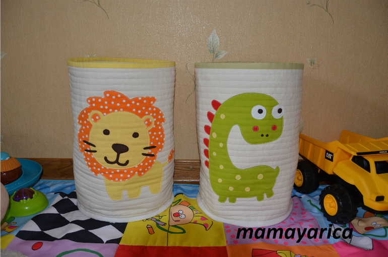Корзинки сшиты из льна, укреплены флизелином и простеганы тонким слоем синтепона. Апликация из американского хлопка. На обратной стороне еще есть надпись LION и DINO, тоже апликация. Сшито с помощью мастер класса Ольги Helga-Cat, вот ссылка http://helga-cat.blogspot.com/2011/08/blog-post_22.html