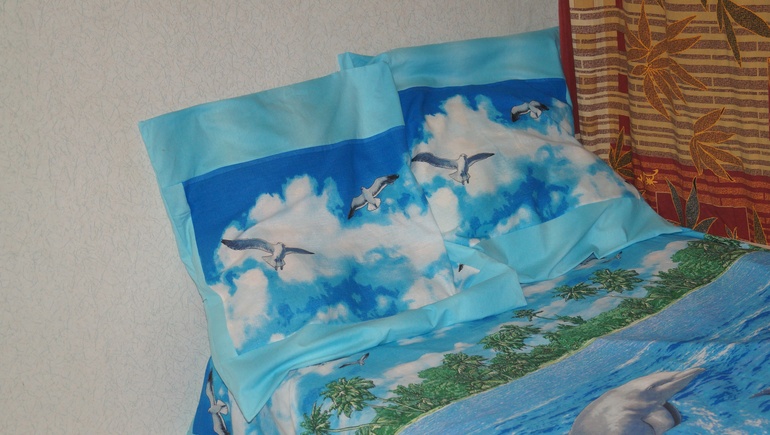 Шила из того, что нашлось дома. Не люблю комплекты просто из отреза ткани. Поэтому добавила вставки из голубой ткани на подушки и кант по периметру пододеяльника. Комбинировала несколько тканей.