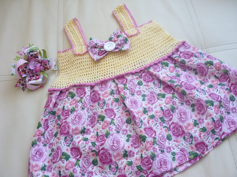 Очаровательный сарафанчик! Как же мне нравится эта манера- вязаный верх и шитая юбочка! Сама лет с 14 за крючок не бралась, но такое с рождения дочки хочу.