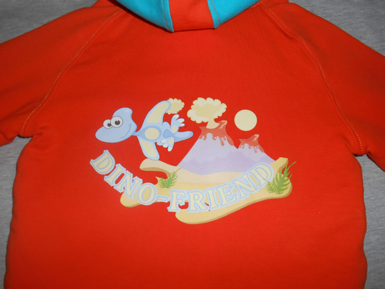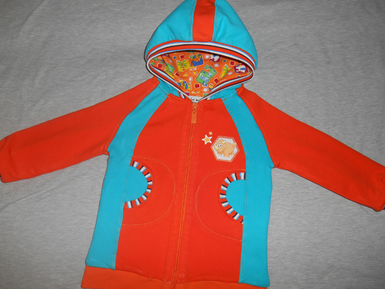 Костюмчик из велюра и футера , на подкладе интерлок , косюмчик вообще давнишний , одели , а после стирки красная рибана бамбук полиняла ( хоть и стиранная) и растянулась , так и лежал костюм , потом постирала ещё пару раз краска отошла . рибану заменила на полосатую , таскали всё лето .