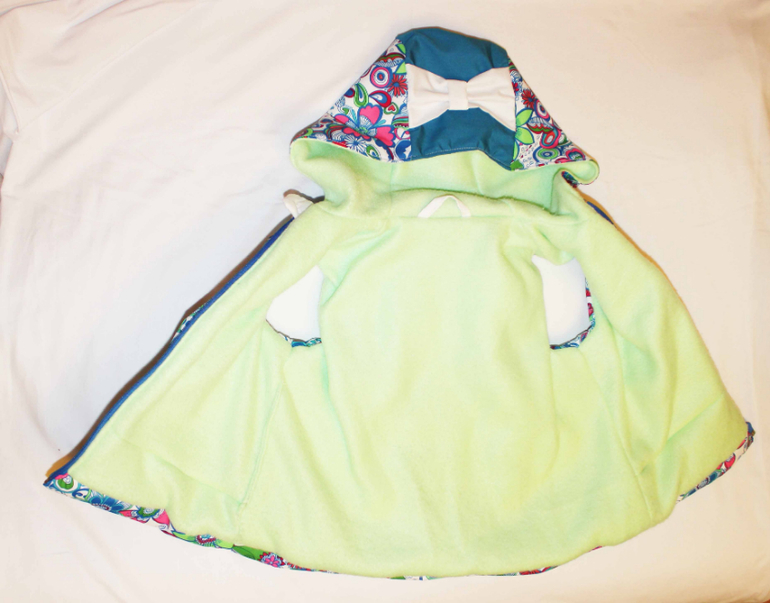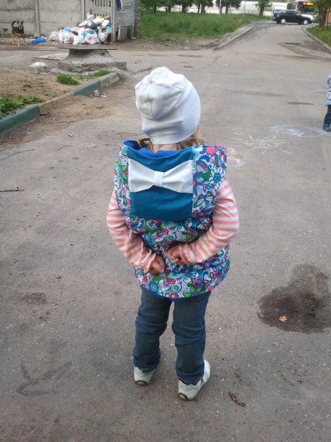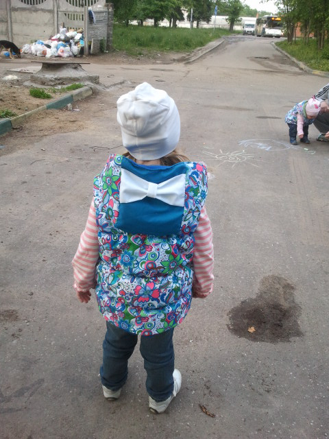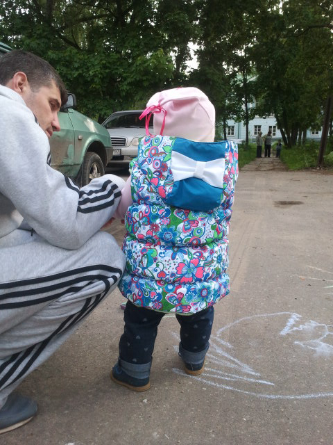 ))))) Спасибо!!!! Специально Ксюшу боком сфоткала там видно жилет торчит вперед, еще капюшон не правильно скроила, но переделывать не стала. Бантик большеват потому что капюшон больше размера на 2 я все припуски на швы больше делаю (с запасом, зачем не знаю )))))))