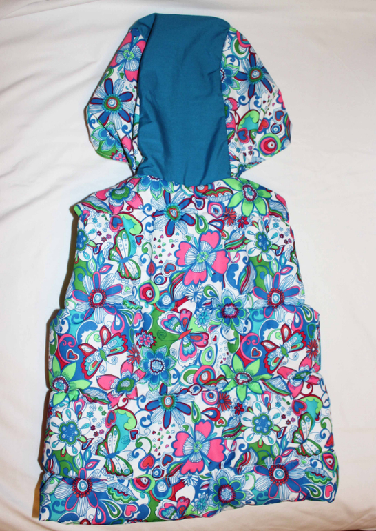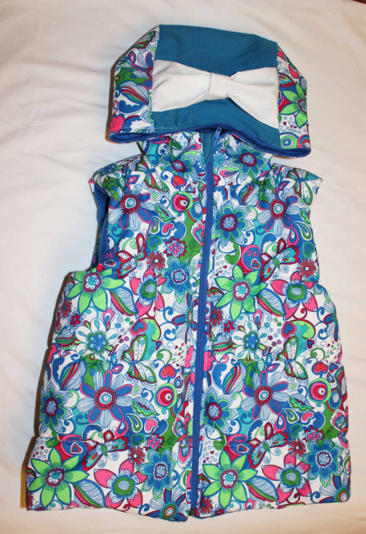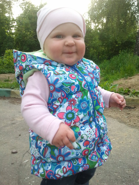 Отличное начало!не нравится:1. однотонная синяя вставка на капе, сморится очень грубо. однотонный компаньон всегда нужно аккуратно добавлять к принту.2. капюшон большеватый. всегда ориентируйтесь на сезонность и на модель шапки, которую носите. т.е. если вы шьете на весну/осень и носите трикотажную шапочку без помпона, то и капюшон делайте неглубокий, кап вам нужен на случай ветра и дождя.3. центральную часть капюшона я делаю по таким параметрам : низ вставки (которая идет в горловину) — 10см, верх — 12см. получается нужная посадка.4. если вам не нравится ширина жилета по подолу, нужно было подол, как раз линию сгиба,тоже ниткой резинкой собрать, тогда бы ничего не торчало, а смотрелось органичнее. дочки у вас красавицы, в красивых жилетах, сшитых мамой) с каждой последующей работой наберетесь опыта))