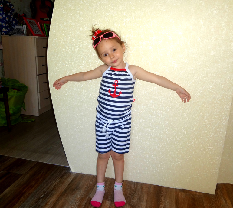 странно,но выкройка майки ей прям как раз 104размера,а штанцы 92)))))майка полностью длинны тут,потом маленький пояс из рибаны и шорты.У них я пояс укорачивала.На сколько?примерь на ребенке и реши сама)))))это целый ребус вчера был)))