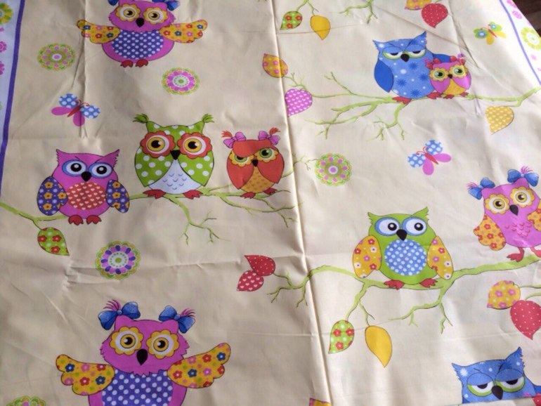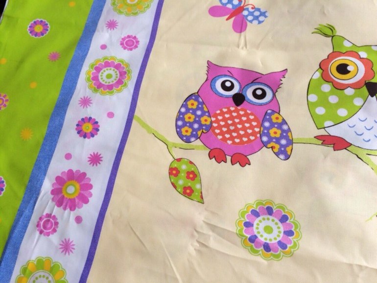Они такие классные, и качество супер (очень плотная бязь). Ширина 150 см, длины взяла 4 м (про запас). Теперь вот кручу верчу и пытаюсь продумать, как будет лучше сделать эти бортики. Шаг между одинаковыми рисунками 60 см, так что кого-то из совушек в любом случае придется обрезать..