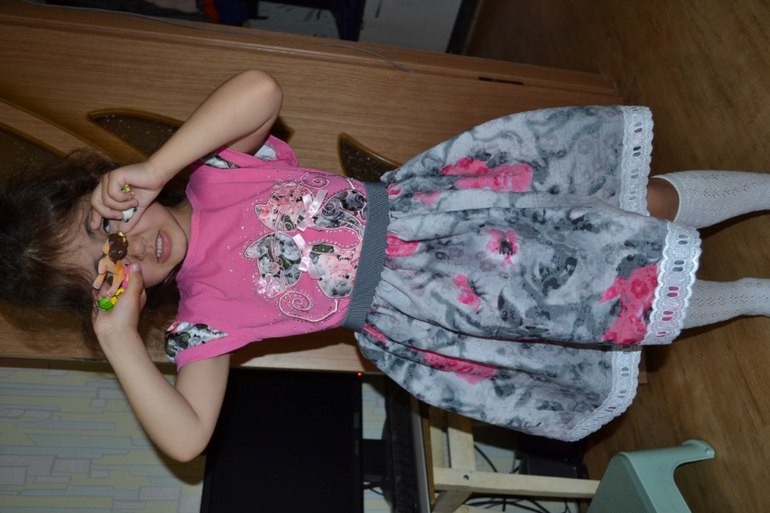 Шьем детямначнем)))) Зашла как то в магазин , а там ситчик такой хорошенький по 180 рэ /метр лежит. Взяла. Вот из метра получилось такое платьюшко, топик( почему то забыла фотку сделать) и повязка. Класс! Два наряда за 180 руб))))) К платью связала быстренько болерошку из хлопка