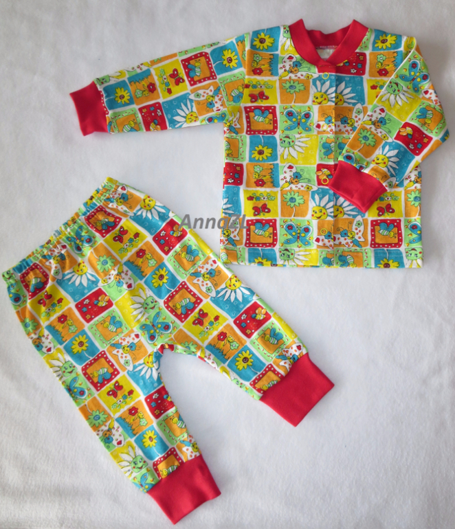 Кулирка с ярким принтом, из 1 метра получились- слип, футболка, рубашка и 2 пары ползунков (все 68размер).