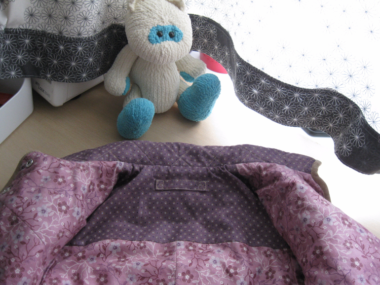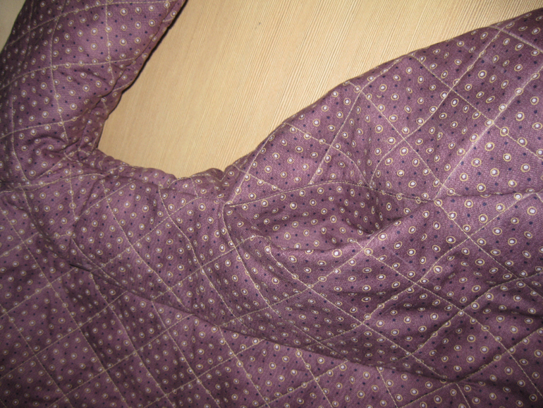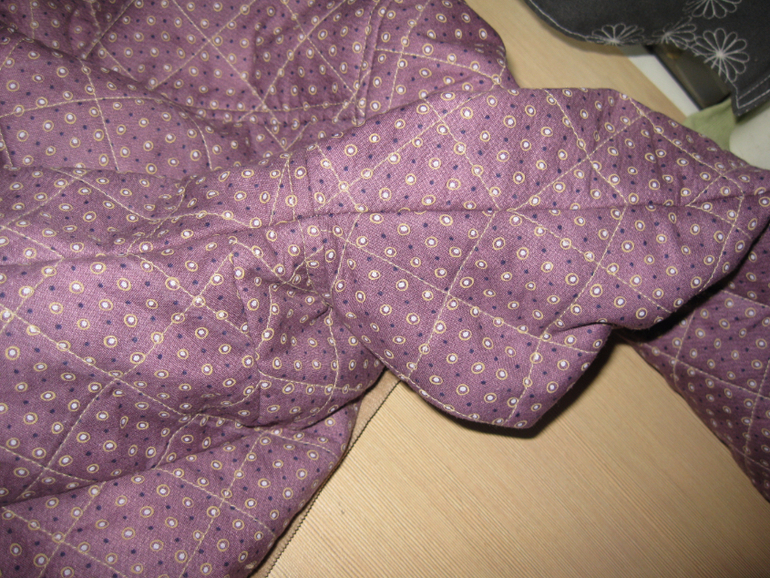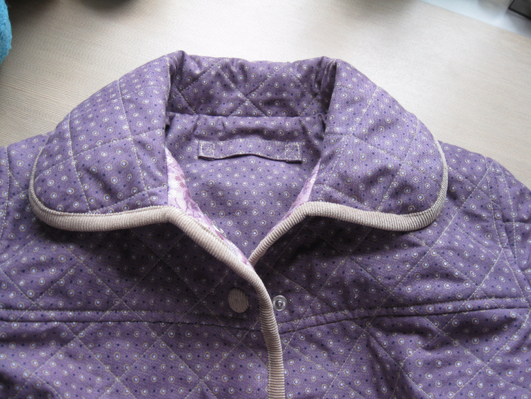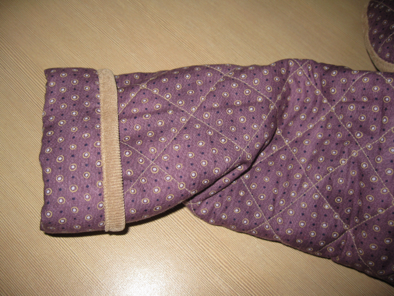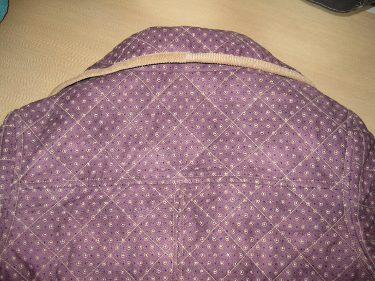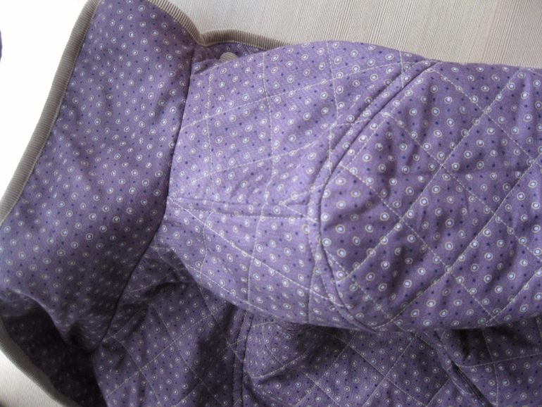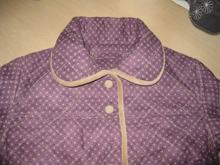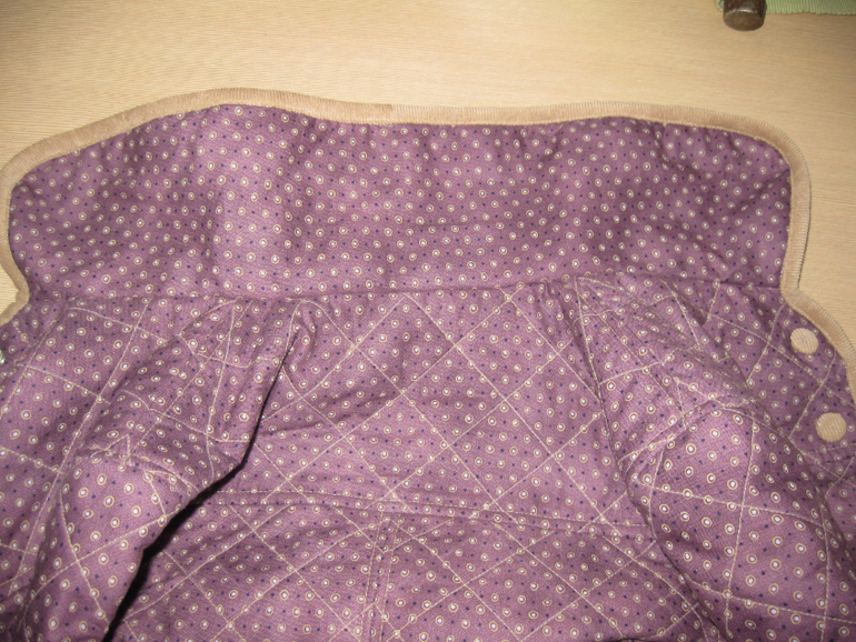 ткань американский хлопок, внутри плотный тонкий синтепон, стежка ромбами, вначале раскроила с прибавками, простегала, проверила по выкройке, подравняла где нужно было, собрала в изделие верх, собрала подклад, вложила друг в друга и окантовала вельветом (был такой противный не хлопковый вельвет, а сюда отлично подошел по цвету).