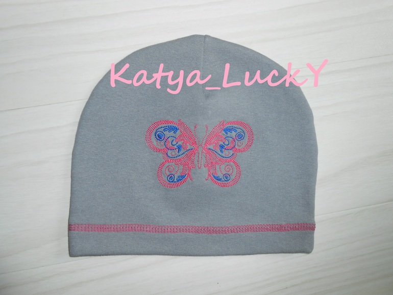 И в комплекте шапочка: рибана, машинная вышивка - любимая фантазийная баьочка из топа моих любимых дизайнеров, OESD. Цвет бабочки повторяет основные акцентные цвета принта - брусника и василек: