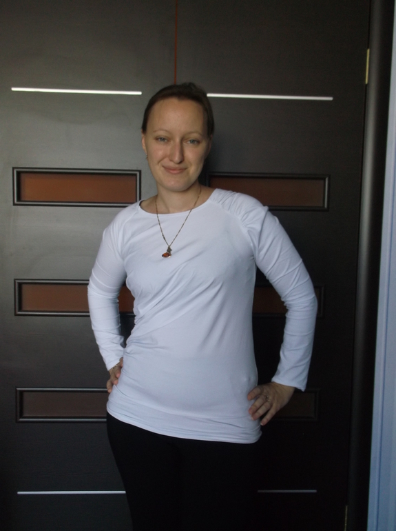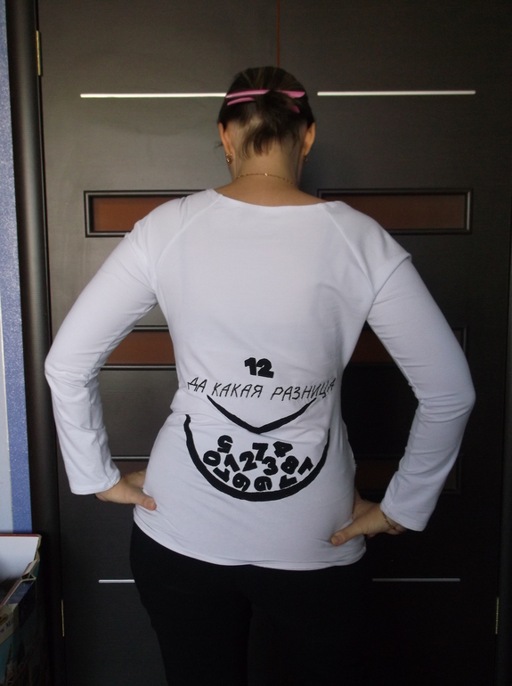 Изначально думала сшить просто белую футболку с длинным рукавом, чтоб носить ее под сарафан, но в процессе все поменялось. Хотелось всего и сразу: и драпировку (я их очень люблю) и сбоку, и на рукавах, и аппликацию тоже какую-нибудь хотелось))) Поэтому футболка получилась "двуличная".))) Драпировка спереди (в правом боковом шве и левом реглане) чтобы прятать в ней спасательный круг и аппликация сзади. На морду лица не смотрим, я ее полночи шила и потому не выспалась