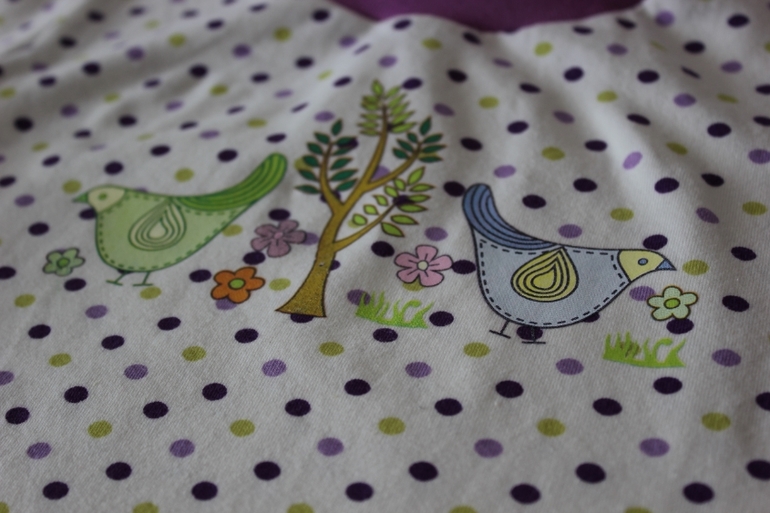 Второй из кулирки с лайкрой Горошки. Ворот из рибаны. Термотрансфер Птички.