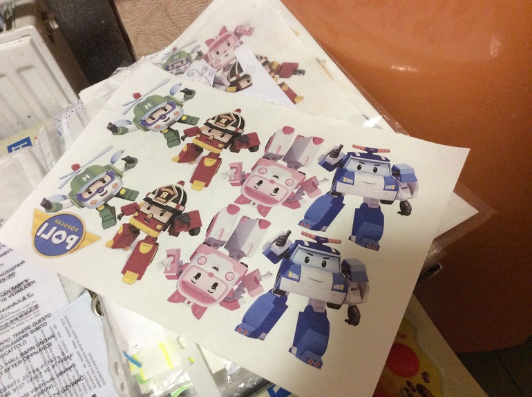 Да и еще я хочу чтоб рисунок цветной был. Ну и с белым понятно. Мой Пупс тащится от мультика Полли Робокар. Там машинки разные. У них всех на корпусе белые детали есть.. Есть трансферная бумага для темных тканей, вот знать бы там белый будет цвет фона?..