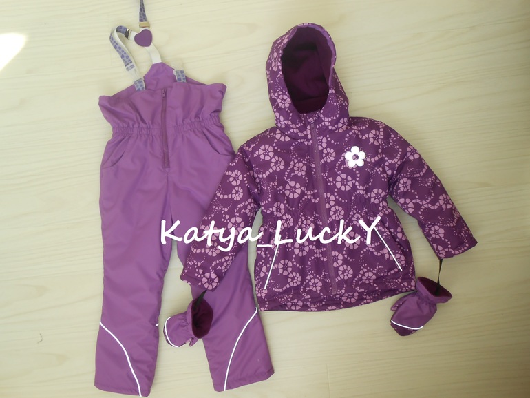 Комплект р.104 для плотненькой девочки, состоит из укороченной парки, полукомбинезона, варежек и шапочки.