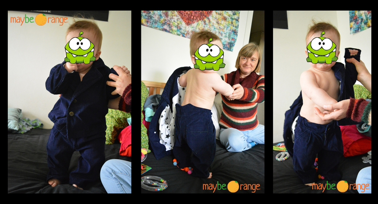 Пригласили меня тут на свадьбу. А за неделю оказалось что с Максом посидеть некому. Решено было пойти с Максом и сшить ему одежку посолиднее. Сшился пиджачок и брюки модные, ткань темно синий вельвет из бабушкиных закромов, высветляла фотошопом, чтоб виднее было, штаны с намтоящими карманами и ширинкой на змейке, все как у взрослых) сегодня с утра пуговки поставила. Планировала еще рубашку-бодик и красную бабочку. Но вчера оказалось, что мама таки может с ним посидеть. Так что куда теперь оно? =( будем считать, что опробовала выкройку. Чиносы сидят здорово, шьются легко. Но, из старых тканей таки плохо шить, вельвет даже оверлоченный сыпется и ширина у него метр х__х. Следующие буду таки из современных тканей шить.