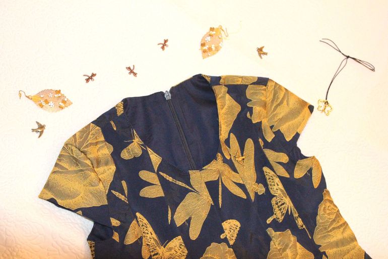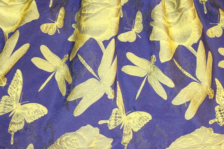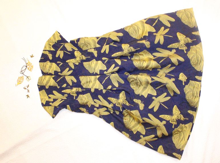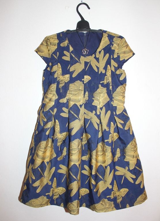 Первое платье из очень красивого жаккарда, выбирали из четырех видов расцветки: розовых роз бабочек и стрекоз на темносинем фоне, синих на черном, зеленых на черном и золотистых на синем. Девочка остановилась на золотистых. Подклад хлопок.