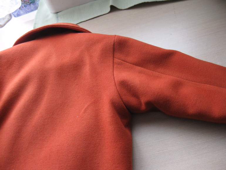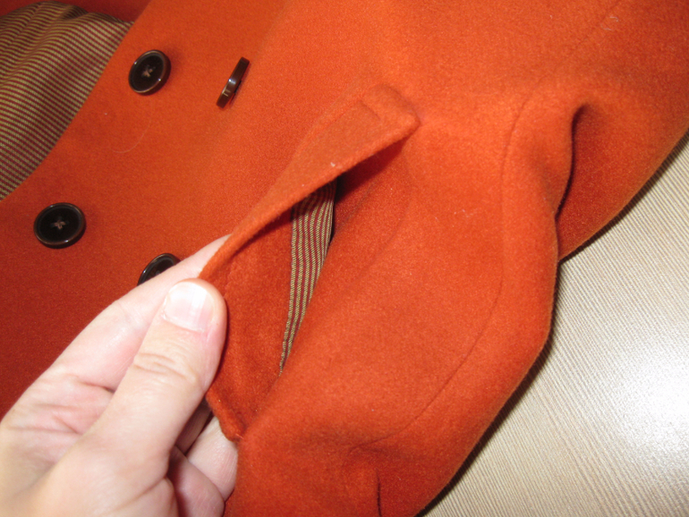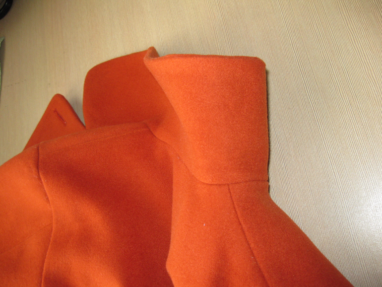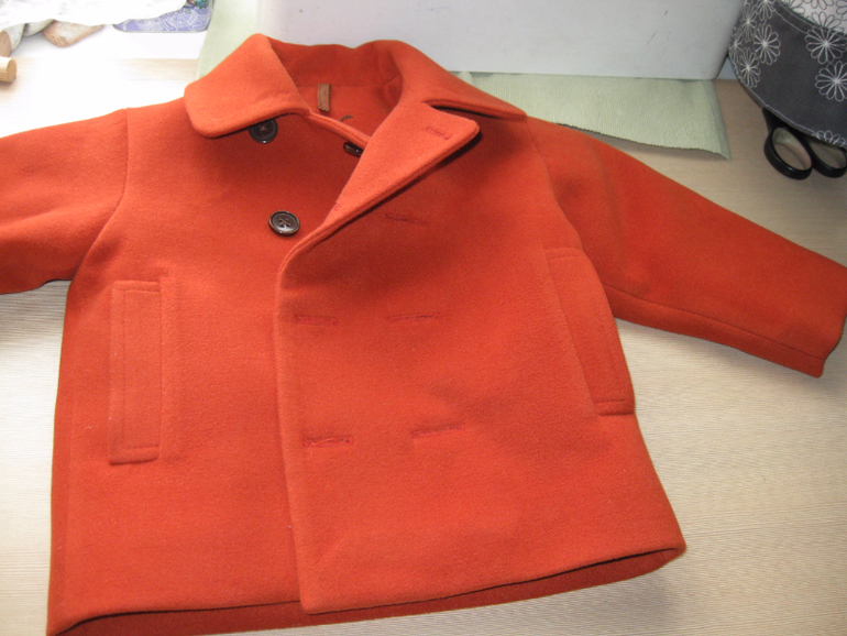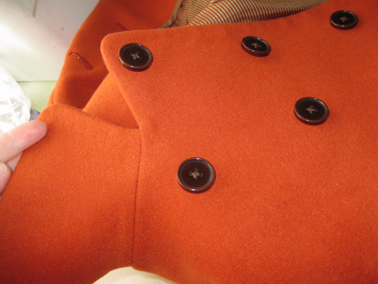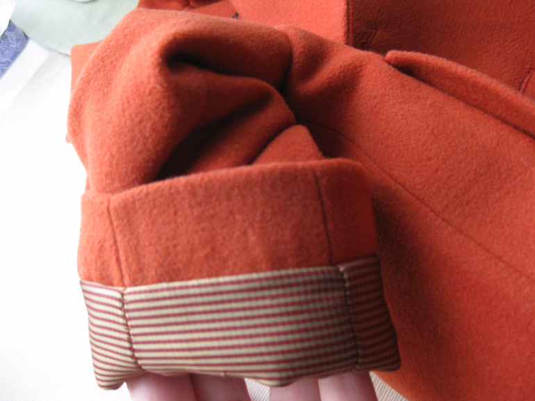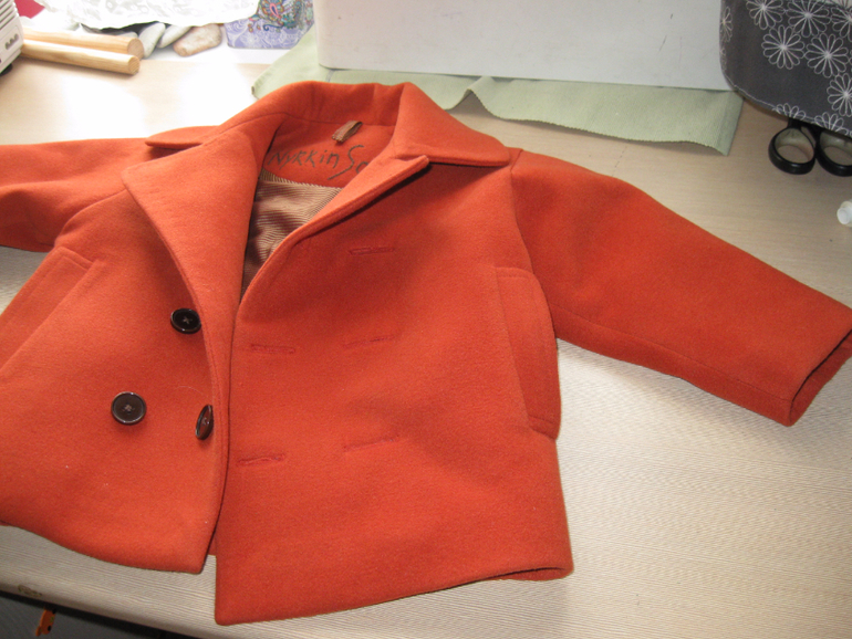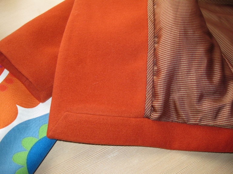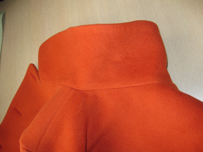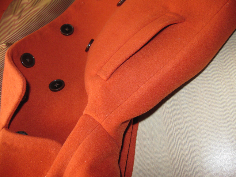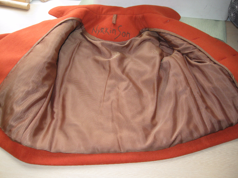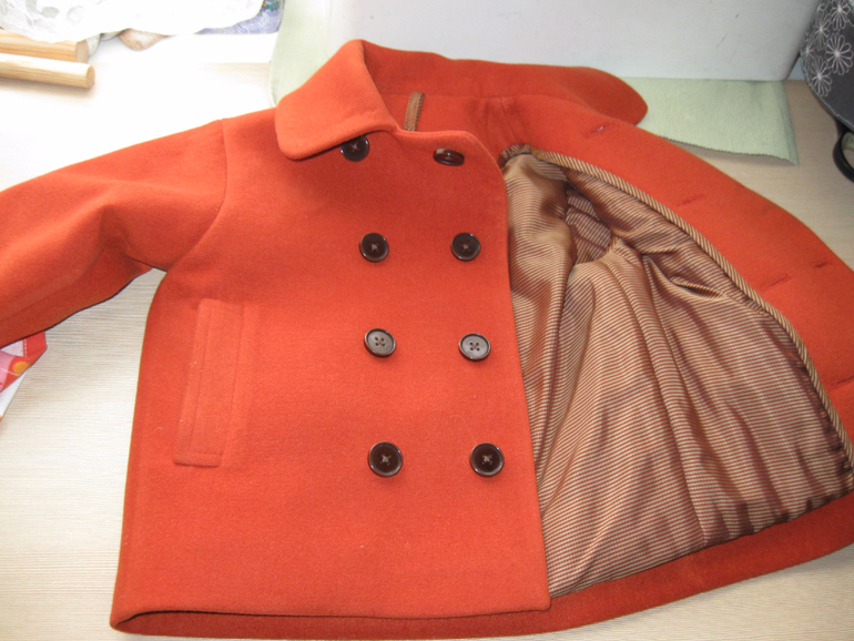 Используемые материалы: мягкая пальтовая ткань кирпичного цвета, подклад вискоза оранж и черн клетки, добавлен утеплитель альполюкс 100 (т.к. эта пальтовка не очень теплая), прошито оранжевыми плотными нитками.