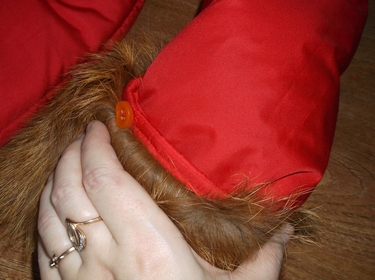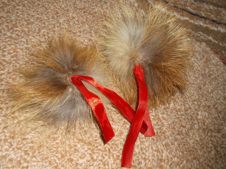Помпоны из живота получились жиденькие и белесые... Выделка шкуры неравномерная, на капе опушка - хребет - там мездра толстая и дубовая, подшерсток ооочень густой, машина даже забуксовала. На манжетах - тонкая и сухая, как пергамент, боялась порвать.