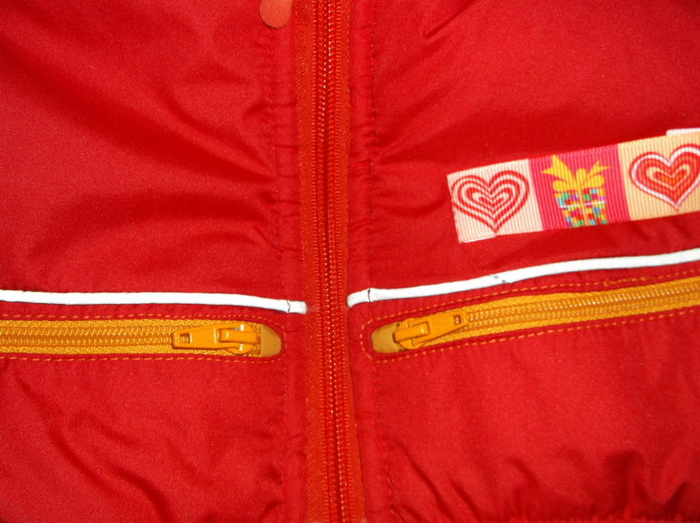 Сначала отрезала кокетку, а потом вспомнила, что карманы на груди хотела сделать. Еле вписалась... Молнию центральную хотела оранжевую, примерила ту, что дома была, а она короткая оказалась((( да и подвеска на бегунок пришла пришла невнятного цвета, хотя заказывала цвет "апельсин". Нашивку вчера отпорола, нет ее теперь.