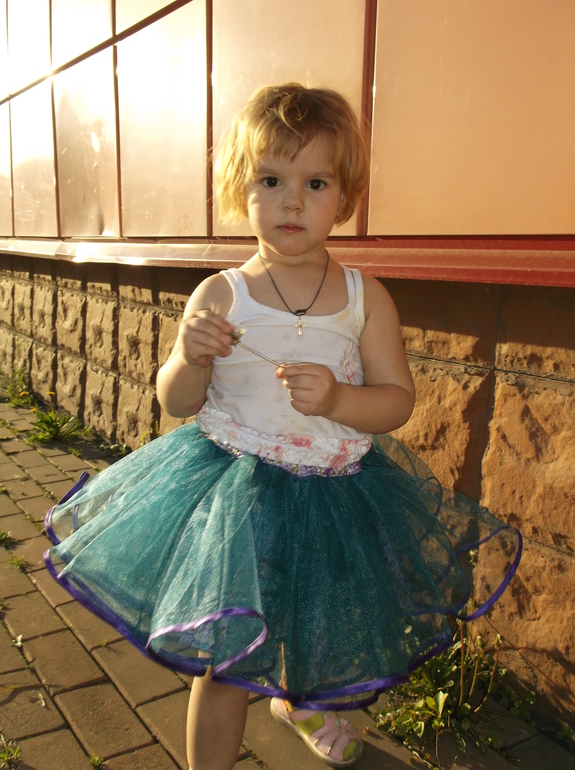 Надо бы сюда трикотажный подклад телесного цвета, ну, я бы так сделала. А про фатин: вот у меня на детской юбочке фатин одной полосой почти 9 м, очень плотная сборка. Он у меня шириной 1,3м, я нарезала 7 полос 30см во всю ширину и сшила их в 1 длинную (это на талию 50см)