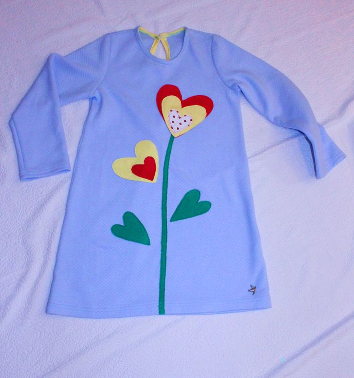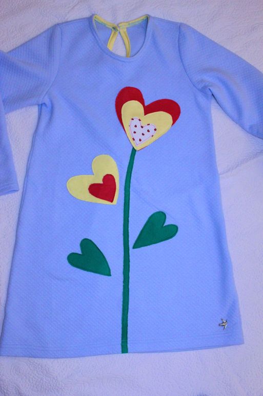Шьем детямНасмотревшись тут на мастериц высшего пилотажа по пошиву трикотажа, решила, что мне тоже нужно это дело освоить. Закупила на Осинке капитоне и вот моя первая работа. Платье А-силуэта, аппликация - какой-то имевшийся дома вискозный трикотаж и кусочек трикотажа с сердечками снова из закромов родины ( дочери шила из него кофточки когда она была совсем малявка). Размер 122 см, отделка тот же самый имевшийся дома тонкий трикотаж желтого цвета. На фото что-то горловина кривая, но на самом деле она ровная))