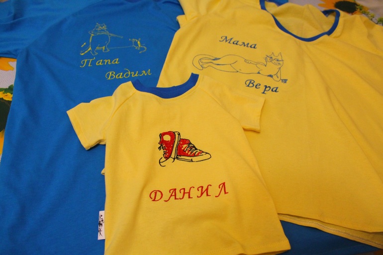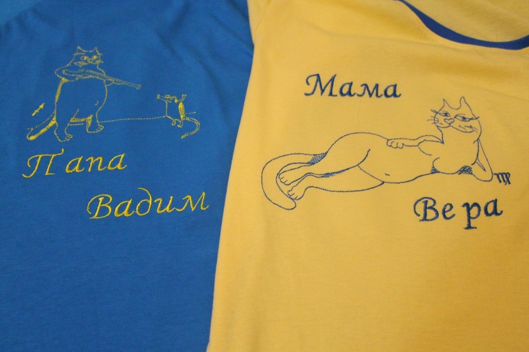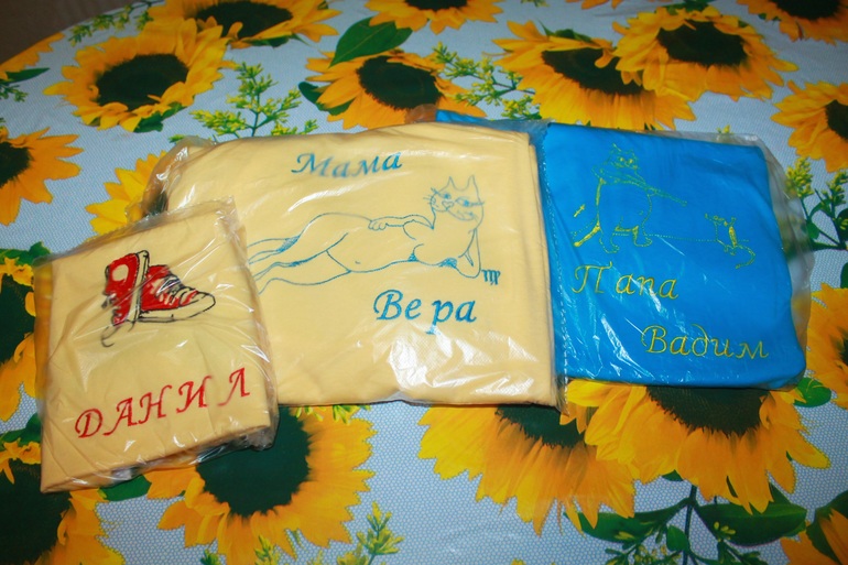 Шьем взрослымВот сшила подарочки для подруги и её семьи, мужу, ей и сыночку по футболочке с вышивкой. На взрослых футболках шуточные картинки с обозначением знака зодиака и надписи.