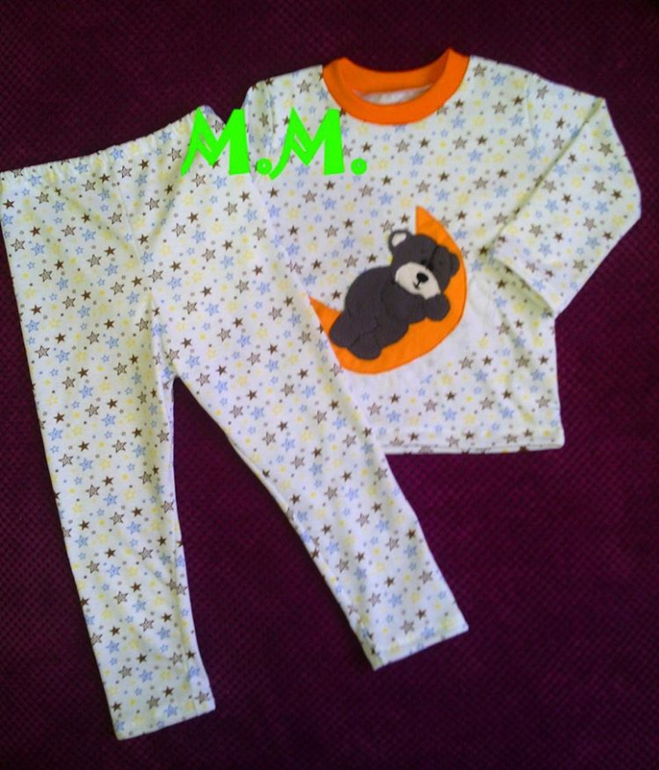 Пижамка для дочки подруги. Выкройки на рост 86. Штанишки так и вышли,а вот кофточку на сантиметр увеличивала спинку,полочку и рукав и все равно на 80 получилась. Первый раз делала многослойную аппликацию по мк в сообществе, боялась,что не получиться,но оказалось все не так страшно) ткань кулирка,отделка рибана, аппликация кулир и флис