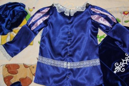 Ткань: синий искусственный шелк, синий бархат, розовый креп-атлас из допотопных запасов, кружево из бабушкиных запасов, пришивная бусина, типа пластмассовые стразы на нитке (старые)