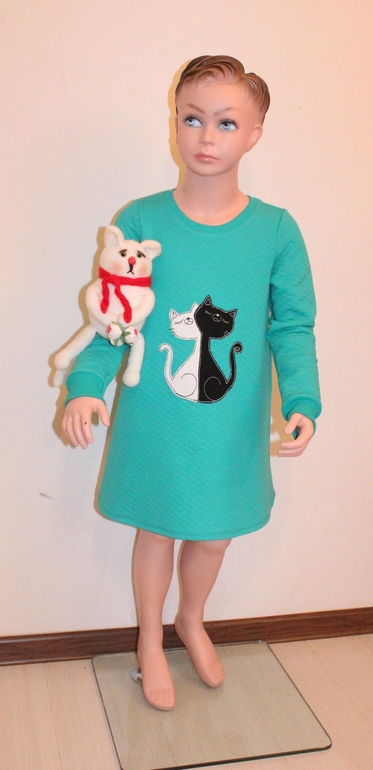 Размер 122 см, выкройка из Бурды 1/2016 ткань капитоний, аппликация из тонкого трикотажа, манжеты и горловина из кашкорсе. Кошек шила три часа, платье полтора)) Шить такую ткань одно удовольствие.
