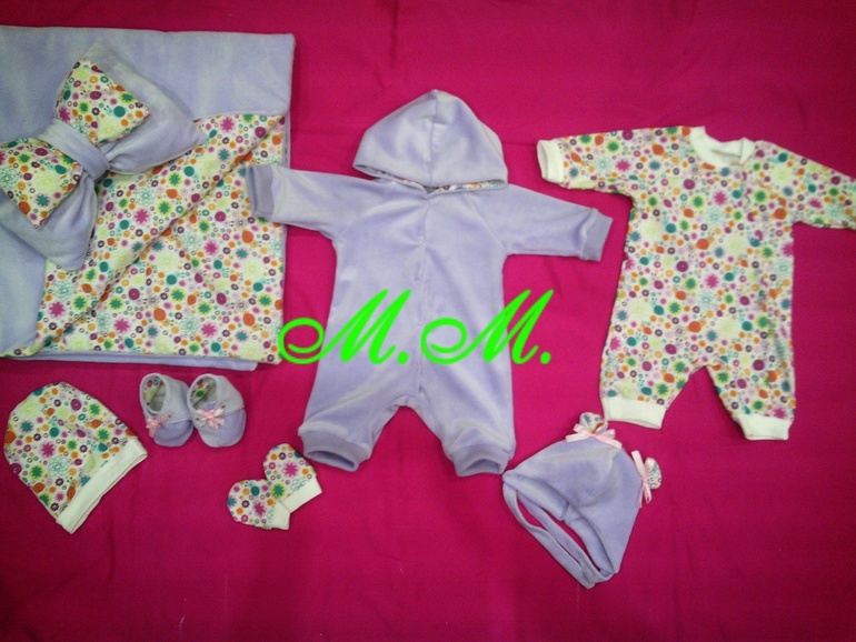 В комплект входят одеялко 1*1 м велюр хб пенье,очень мяконький,утеплитель 100 и кулирка хб.,бант на резинке,двухслойная велюровая шапочка с ушками, тоненькая шапочка,пинетки, рукавички, велюровый комбезик с капюшончиком и тоненький слипик. Коммбезики из оттобре немного переделанные,теплая шапочкаот Екатерины,очень хорошая выкройка, немного переделала, пинетки тоже от бейбирушки остальное так на глаз)