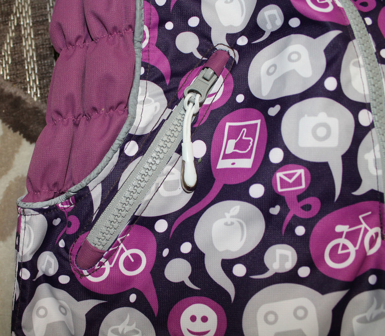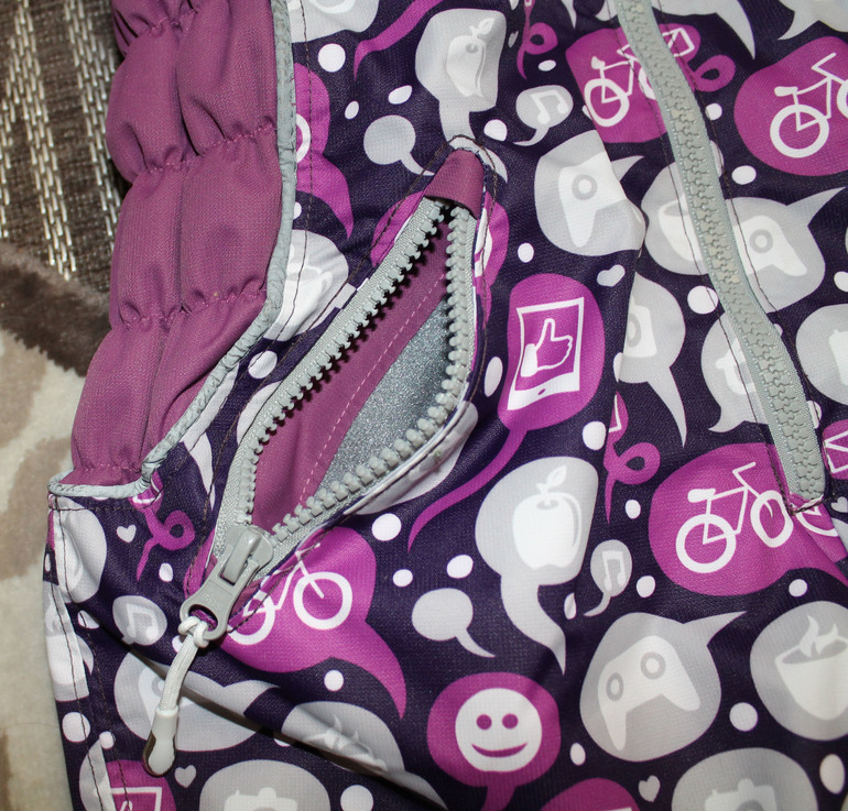 Карманы на молнии в овальную рамку. В карманах как и на подкладе серая каризма.